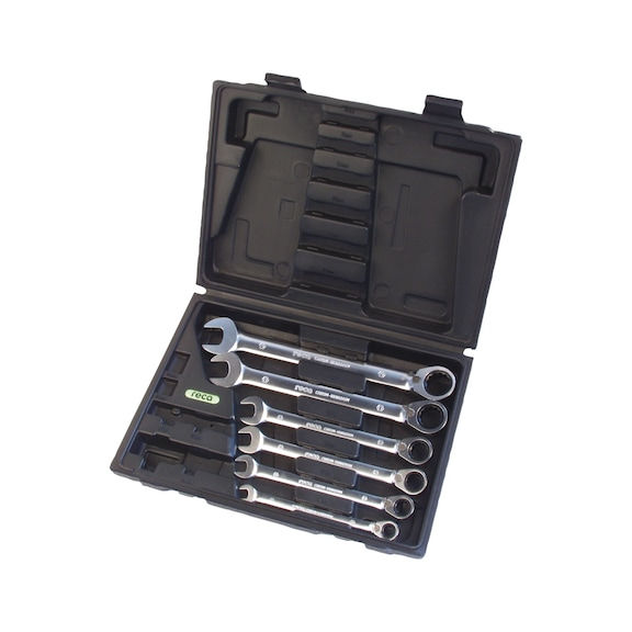 Der Ratschenkopf ist mit 15° abgewinkelt und ist umschaltbar (rechts- / links-Lauf). Verpackt ist der Satz in einem Kunststoff-Koffer.